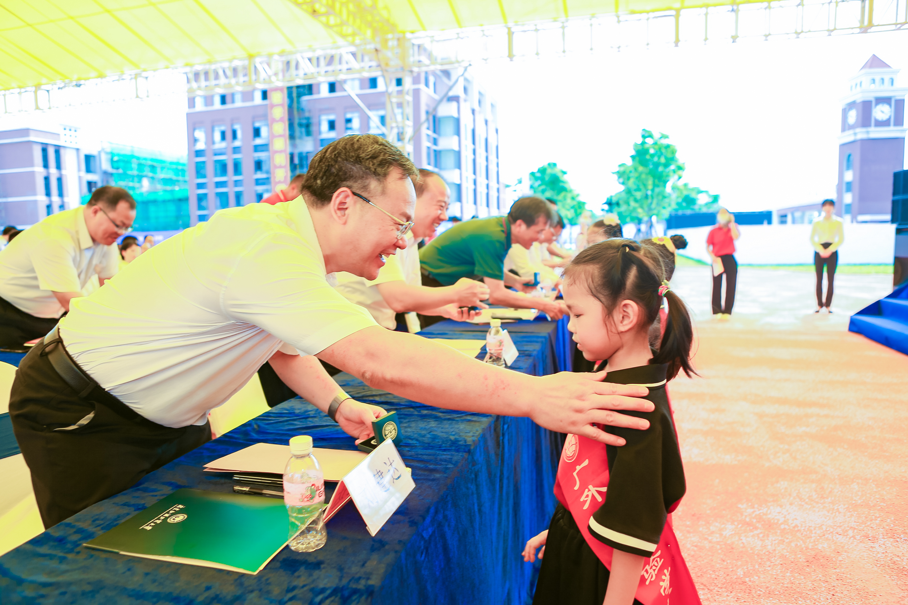 广外附设茂名实验学校的新生代表们,为到场领导嘉宾献上了荣誉校徽。校徽寓意着托起明天的太阳,希望学生们立大志向、探求真理、攀登高峰。