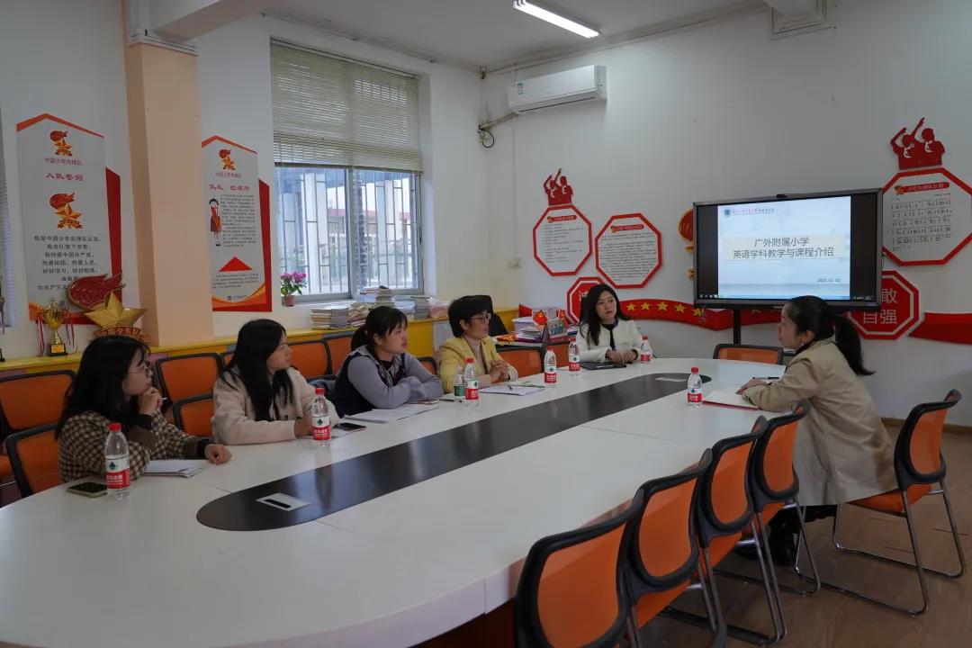 随后,江沛娟一行和附小课程教学中心副主任唐龄、英语组组长喻安婷在大队部活动室进行了交流。唐主任向大家介绍了附校整体课程规划、英语教学与课程设置等情况,并着重介绍了英语戏剧课程及其分层作业设计。