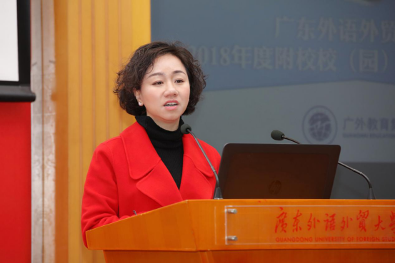广外基础教育研究中心执行主任沈璐代表教育集团对刚结束的2018年度广外附校英语学科考核与调研做了总结汇报。沈璐基于课程建设、教师教学、学生活动、校园文化、学校管理等5个学生英语学业水平影响因素出发,从13个一级指标和43个二级指标分析了各附校在英语学科建设方面的成绩与不足。同时根据调研结果,提出了未来教育集团在学科引领、协同创新、智库建设等方面的工作设想。
