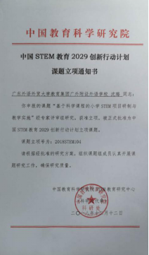 12月15日,教育集团旗下两所学校广州市白云区广外附属小学(“广外附小”)和广州市广外附设外语学校(“广外外校”)两项“中国STEM教育2029创新行动计划”课题成功通过开题答辩。这是两所学校继今年7月获批“中国STEM教育2029创新行动计划”首批种子学校以来,在STEM教育中取得的又一次重大成绩。