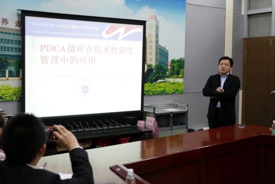 肇庆外校校长周小飞结合广外肇庆外校近几年学校的经验,阐述了如何在招生中有效运用PDCA(计划、实施、检查、总结)的循环管理模式。