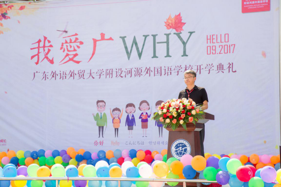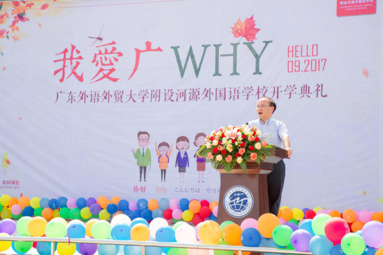 在庄严的升旗仪式结束后,广外河源外校首任校长毛南辉致欢迎词。他细数了学校更名改建以来发生的脱胎换骨的6大变化,同时他还提出,广外河源外校将始终秉承“快乐生长,共同成长”的办学理念,把学校办成河源最好的基础教育学校,办成粤东北最好的外国语学校。