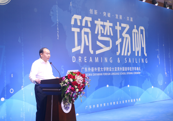 广外附设大亚湾外国语学校副校长朱传久发表了热情洋溢的开学致辞,他首先代表学校表达了对各级领导、各位嘉宾、各位家长的欢迎和感谢;同时对全体老师和学生提出了新希望、新要求,提出将广东外语外贸大学附设大亚湾外国语学校打造成全区、全市及至全省品牌名校的办学目标。他还特别提到,2016年9月28日是广东外语外贸大学、惠州市大亚湾区管委会、深圳市君跃投资有限公司三方签约的日子,为了纪念这个特别的日子,学校决定把9月28日作为广东外语外贸大学附设大亚湾外国语学校的校庆日。