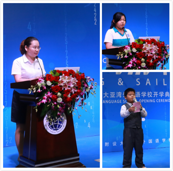 广外附设大亚湾外国语学校教师团队,有着一批从全国各地选聘的高学历高素质的名师队伍,有剑桥大学硕士研究生的归国学子,有全国重点师范院校的毕业精英,有教学经验丰富的金牌名师。教师代表陈保冰老师、初一学生杨果同学、一年级学生代表范礼鹏同学分别在开学典礼上发言。