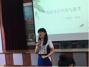 “江西临川中学语文教师、广外外校教学处副主任、广外外校小学部主任、广外外校副校长、广外肇庆外校校长、教育集团副总经理”。徐纯从五个阶段畅谈了自己的教育生涯。“如何管好一所新学校?”徐纯介绍了自己摸索出来成功做法:“立愿:建立共同愿景”、“建制:构建管理机制”、“搭架子:搭建组织框架”等。对今后外派的管理团队,她结合自己的亲身体会,从“准备承担、准备吃苦、准备忍耐、准备受委屈”四个方面与大家进行了亲切地分享。