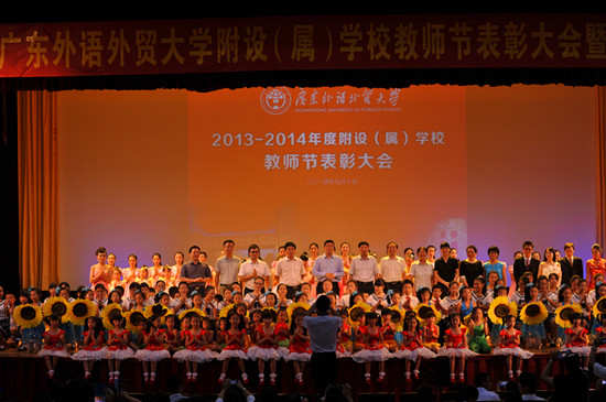 颁奖结束后,在场嘉宾共同观看了精彩的文艺汇演。五所基础教育学校都为文艺汇演贡献了精彩的节目。其中,广外外校的管乐合奏气势恢宏、激情四射,幼儿园的童话剧《守株待兔》师生同台充满童趣;增城外校的歌舞《新星升起》是在广外的校歌《凤鸣岭南》的旋律上谱出了新词,肇庆外校的舞蹈《我可喜欢你》演出了孩子们的天真活泼,单纯可爱。值得一提的还有,附属中小学专门为本次演出创作了一首配乐诗朗诵《献给广外基础教育教师的歌》,为广外基础教育战线上的广大教师献上了一份美好的节日祝福。
