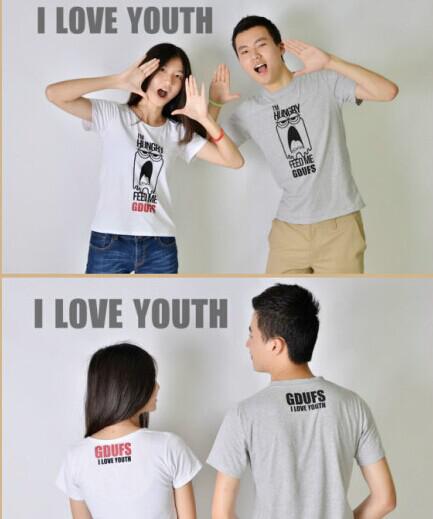 还有一款由学生团队打造的T恤也很吸引眼球,该T恤的正面印有“I’m hungry, feed me, GDUFS”的字样,意寓希望在广外汲取知识、汲取营养。反面印有“GDUFS,I love youth”的字样,意寓在广外挥洒青春,获得成长。