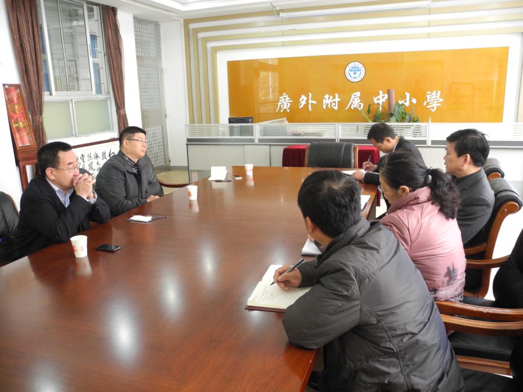 顾也力首先来到附设外校,听取了外校领导班子关于学校开学情况的汇报。教育集团副总经理、校长李建民重点谈到学校今年要全力冲刺国家级示范性高中、广州市特色学校的申报工作,目前全校上下团结一心,士气高涨,力争让外校办学水平新年跃上新台阶。顾也力对外校开学工作情况给予了充分肯定,要求外校继续发挥广外基础教育旗舰学校的作用,当好广外基础教育发展的排头兵,同时也要采用有效方式,激励和培养优秀老师,增强学校的凝聚力和向心力。孙建军希望外校在管理干部培养、教师培训与发展方面花大力气,为广外基础教育事业输送和培养更多优秀人才,发挥旗舰学校的示范和引领作用。