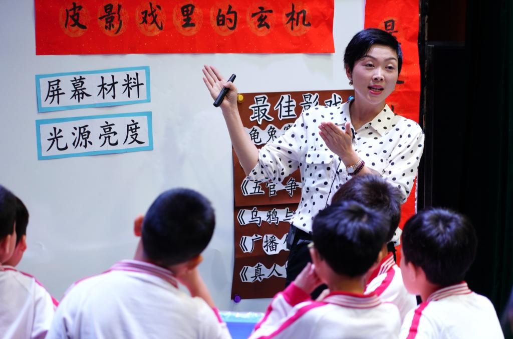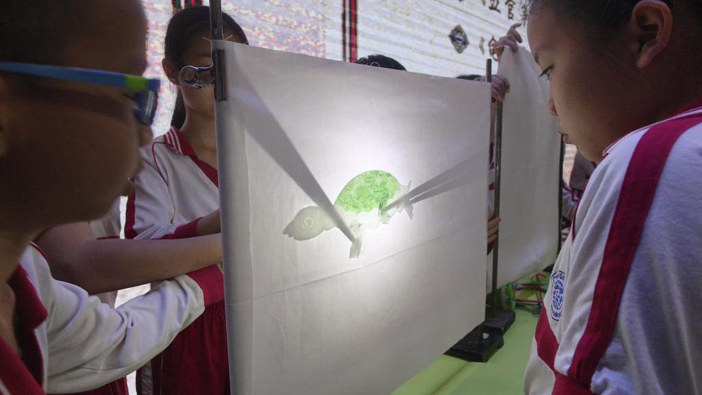 谭可锋老师围绕猜想、验证、推导“皮影戏里的玄机”这条主线,以小组分工合作的方式,整合运用物理、数学、美术、音乐、戏剧等学科知识,引导学生自主探究,让学生通过动手制作皮影戏道具、设计皮影戏剧情,从而了解皮影戏的表演原理,熟悉光与影之间的物理关系,体验STEM智造的乐趣。