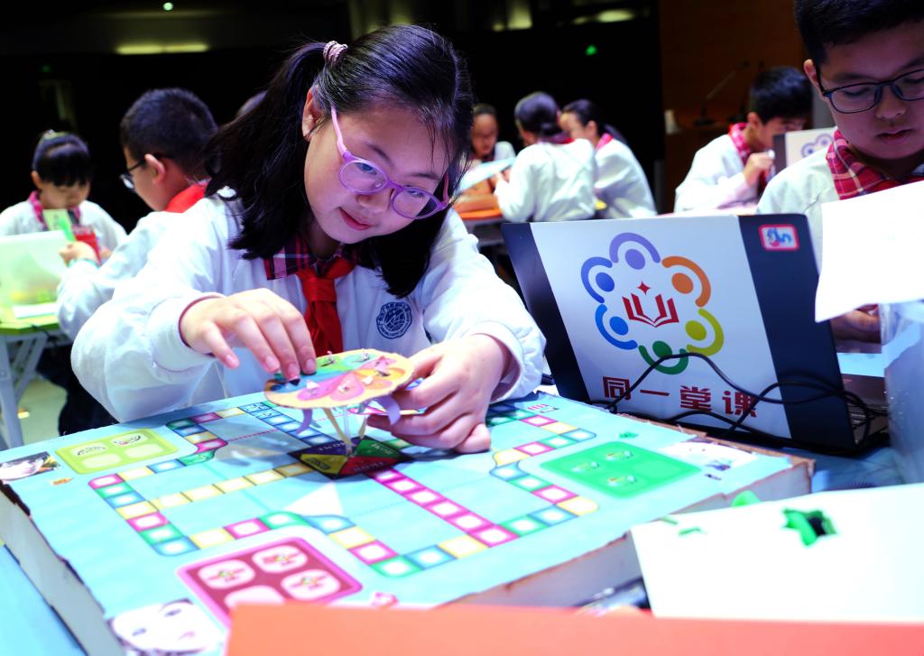 吴玉梅老师则以STEM项目式学习为方法,让学生利用在创客中学习到的一些输入输出设备自主设计和创作智能飞行棋。在本节课上,吴老师要求学生们分组合作,以提高飞行棋棋盘的趣味性为目标,对棋盘进行有创意的优化。学生们现场编程、制作,并展示了最终的成果。