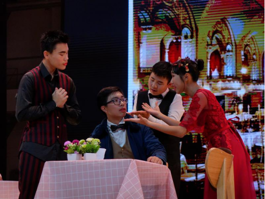 在舞台上,演员们动作到位,情绪饱满,细节丰富,通过语气与小动作,把剧中人物的性格特征与情绪变化淋漓尽致地展现,尤其是餐厅老板与服装店员工的前后变化,把市井小人嫌贫爱富、前倨后恭的态度展现无遗。广外肇庆外校的石红梅老师指出,在英语课中采用戏剧教学模式,能综合提升学生的英语口语、听力、语言表达能力、批判思维能力、创造力等能力。