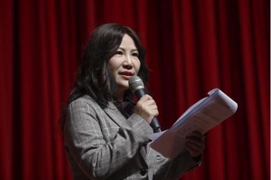 六个精彩剧目表演结束后,梦盒教育董事长Cathy对各校节目进行了点评。Cathy首先向学生们与指导老师的辛勤付出表示感谢,对于当晚的各校表演进行了专业独到的点评并给予充分的肯定与表扬,指出当晚的部分剧目与演员达到了专业的水准,随后还介绍了国内外的戏剧教育的发展历程与现状,同时也充分肯定了广外戏剧教育的工作。