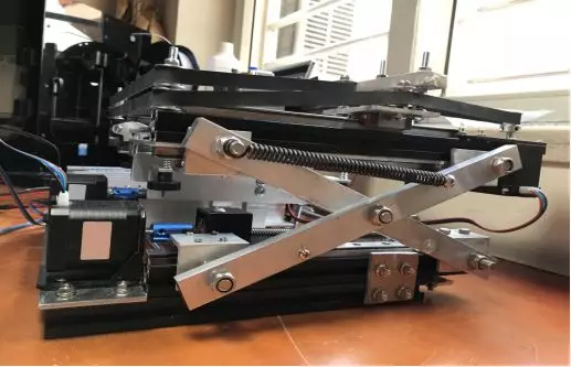 据周秋文同学介绍,使用剪叉式升降的结构,在一定程度压缩了打印机的高度,在待机状态高度可以压缩在15cm甚至更小,是传统打印机高度的1/3,还可以直接放入手提箱或背包里,无需拆解,方便携带,随拿随用。该结构主要适用于小型3D打印机,追求轻小便捷,在不改变打印范围的前提下尽可能缩小整机的体积,提高空间利用率。
