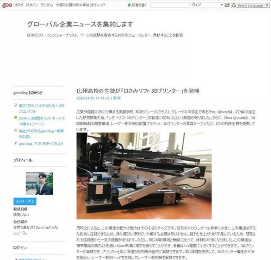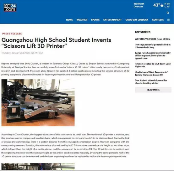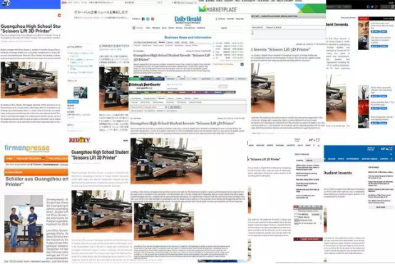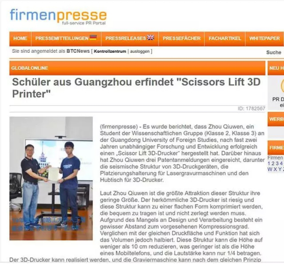 近日,广州市广外附设外语学校(简称广外外校)的高中生周秋文成功研发出一款“剪叉升降式3D打印机”,引起美国、日本、德国、俄罗斯、马来西亚等500多家海外媒体的广泛关注。