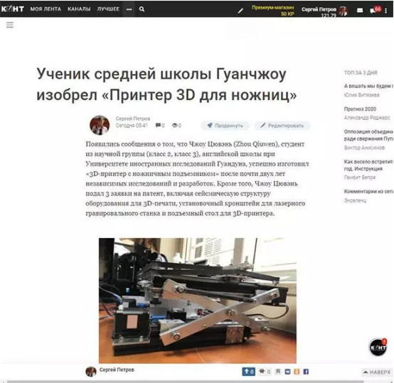 俄罗斯著名新闻网站cont.ws将不少的篇幅用在其发明专利上,文章称,周秋文花费了两年时间,研发出了这款“剪叉升降式3d打印机”,并已向专利部门递交了三项专利申报:包括3D打印用设备抗震结构;激光雕刻机用放置托架以及用于3D打印机升降台。