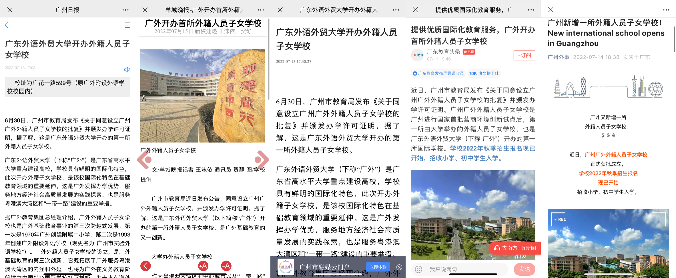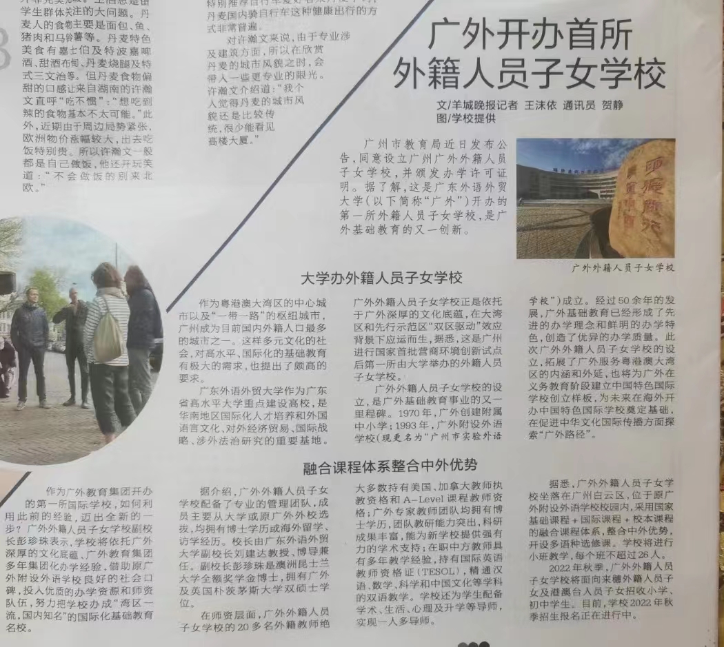 7月13日,广州日报旗下客户端“新花城”发布题为《广东外语外贸大学开办外籍人员子女学校》的报道。