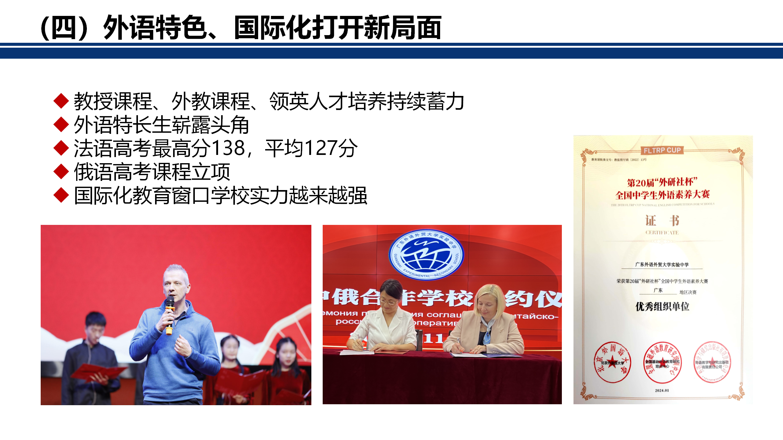 “广外实验中学法语高考成绩优异。首次开启中俄交流,俄语高考课程立项。”——校长徐纯