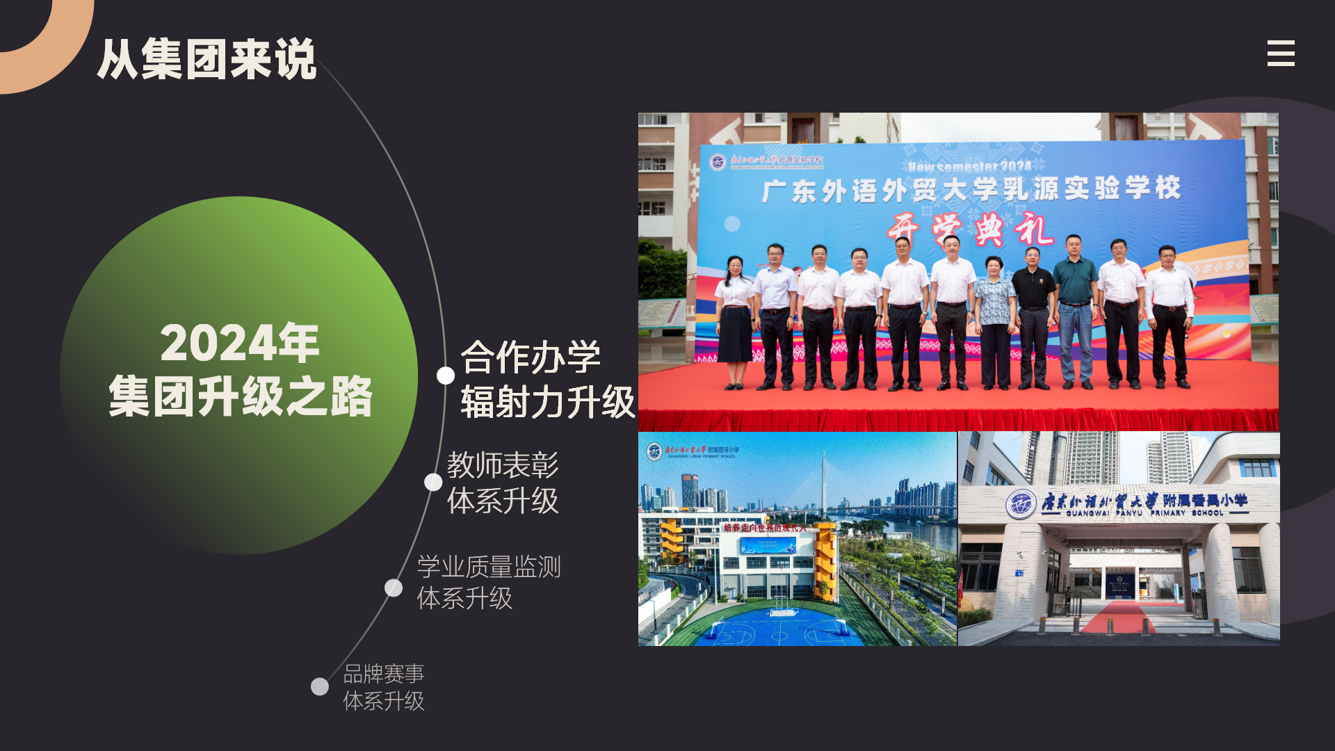集团层面,合作办学辐射力升级,3 所新学校开学,布局拓展到荔湾、粤北等地;教师表彰体系升级,通过新的评选方案增强了集团的认同感和向心力;学业质量监测体系升级,通过系统监测和专题分析会,以及中小学考试研究中心的成立,推动了资源共享和高质量发展;品牌赛事体系升级,第八届“广外杯”中小学生英语能力大赛获得媒体高度评价;集团品牌形象升级,官方宣传片获得广泛曝光和好评,提升了集团的内外形象。