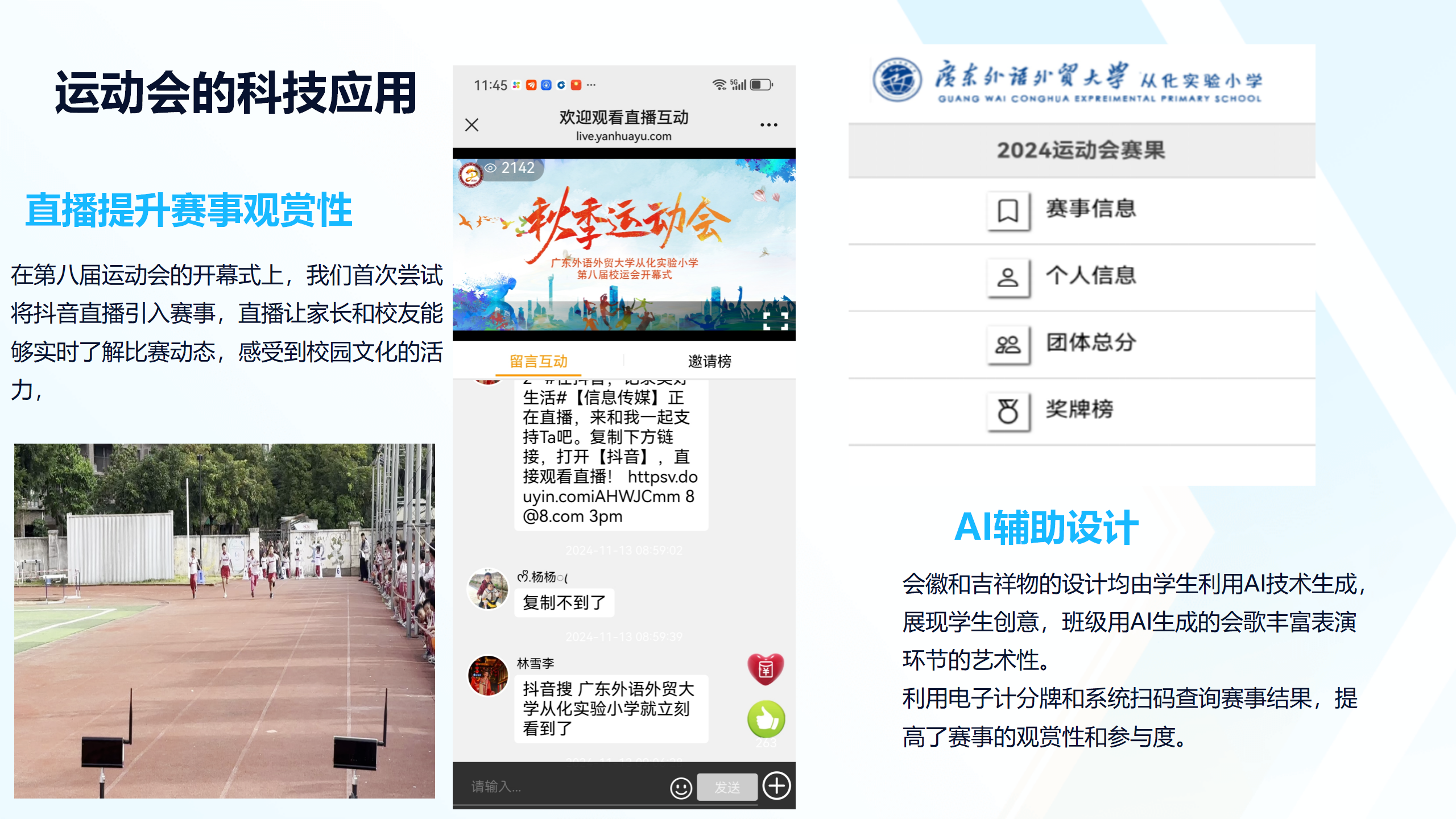 广外从化实验小学在开学典礼、班主任论坛、校际优质课、家长会等活动广泛应用 AI,如利用 AI 生成沟通方案、文生视频,融入智能体环节等。“我们今年为了提高运动会赛事的观赏性,尝试了抖音直播,而且运动会的会徽和吉祥物都是学生们用AI生成的!”——校长黄建华