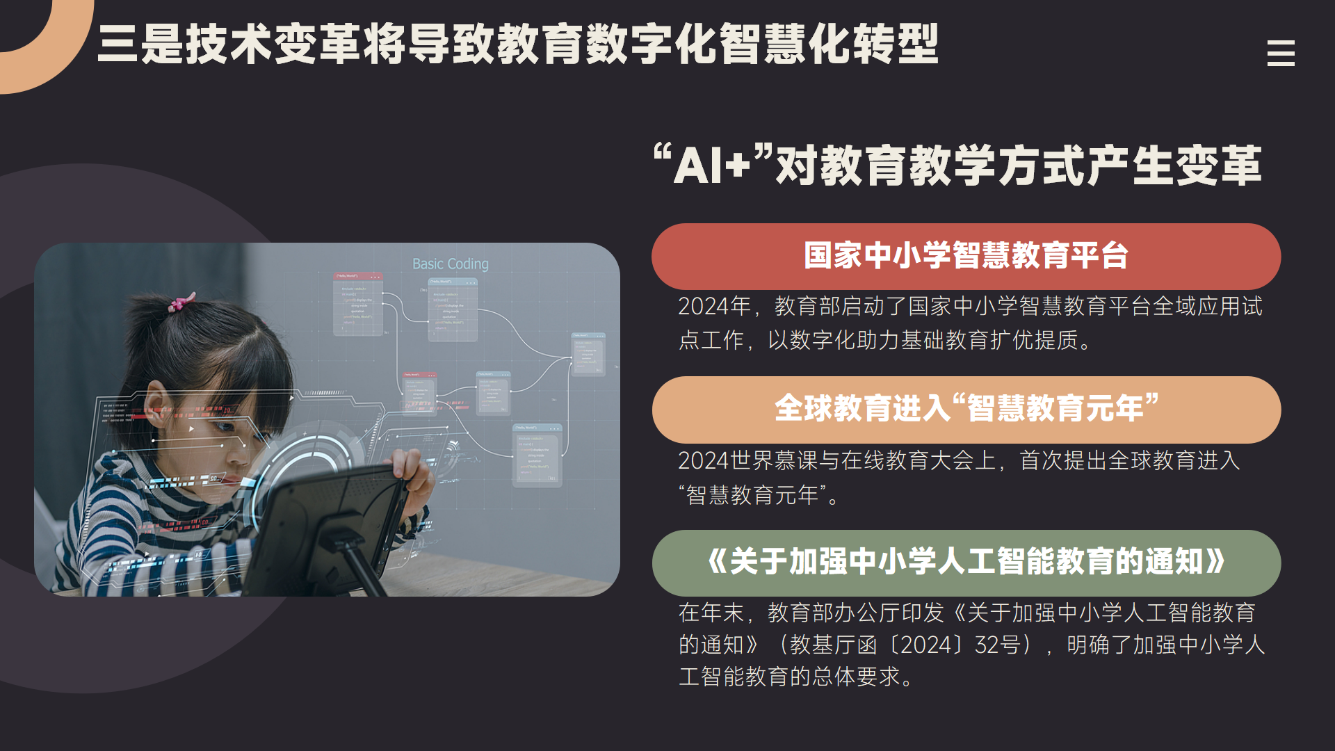 报告指出人口结构改变引发学段与学校布局转型,入学人口变化引发资源动态配置新课题;基础教育高质量发展促使师资队伍向高层次转变,人才培养向基础教育阶段前置拔尖创新人才培养转型,集团学校亟待强化 “科学特色”;AI 领衔的技术变革掀起教育数字化智慧化浪潮,报告介绍了教育部相关政策与行动,倡导学校积极拥抱变革。