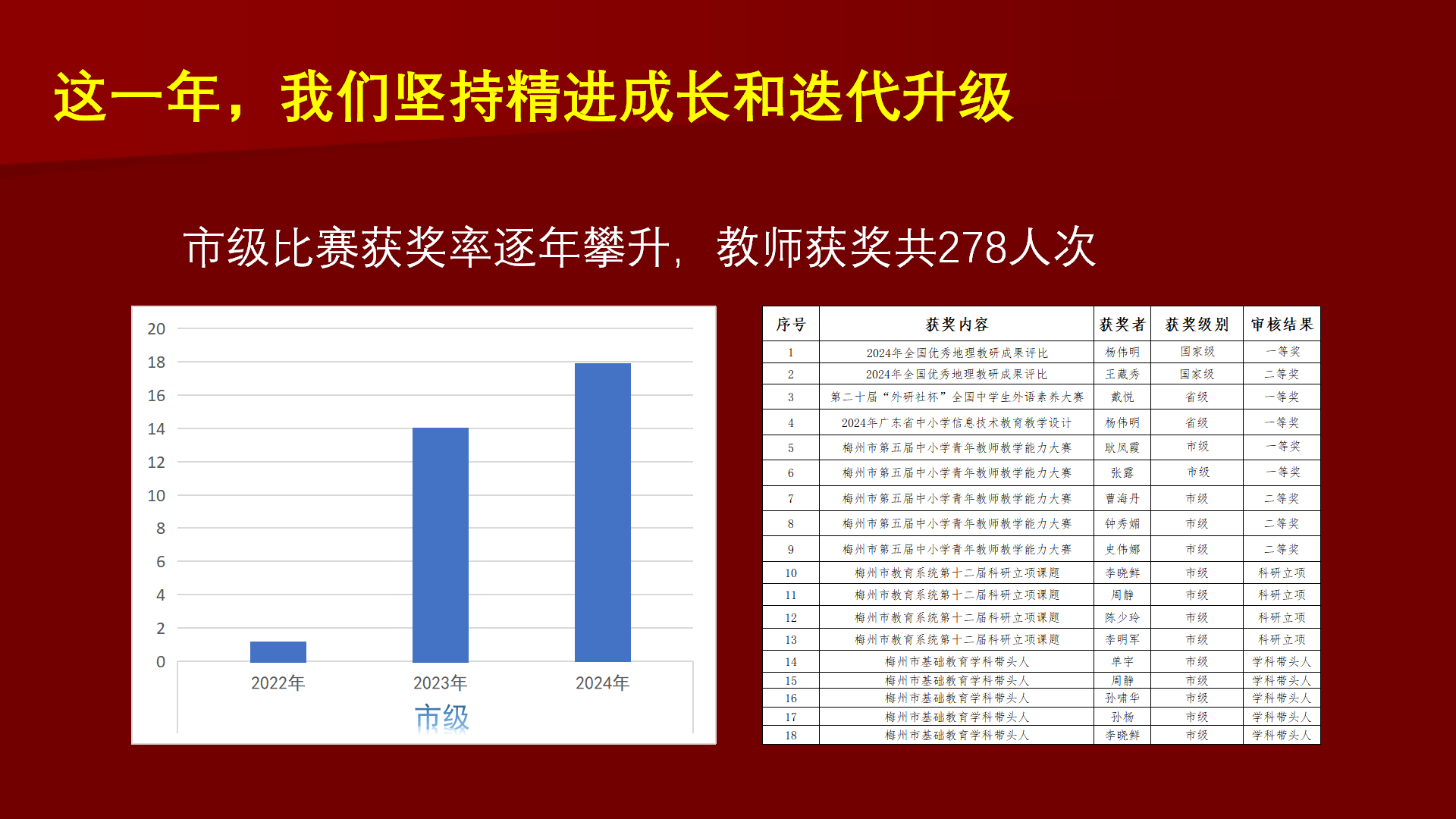 梅州市外语实验学校市级比赛获奖率逐年攀升,教师获奖共278人次。“回望我校2021年、2022年、2023年,老师们的成果需要被看到。我们要看到老师们纵向变化和不断升级。”——校长曹旭飞