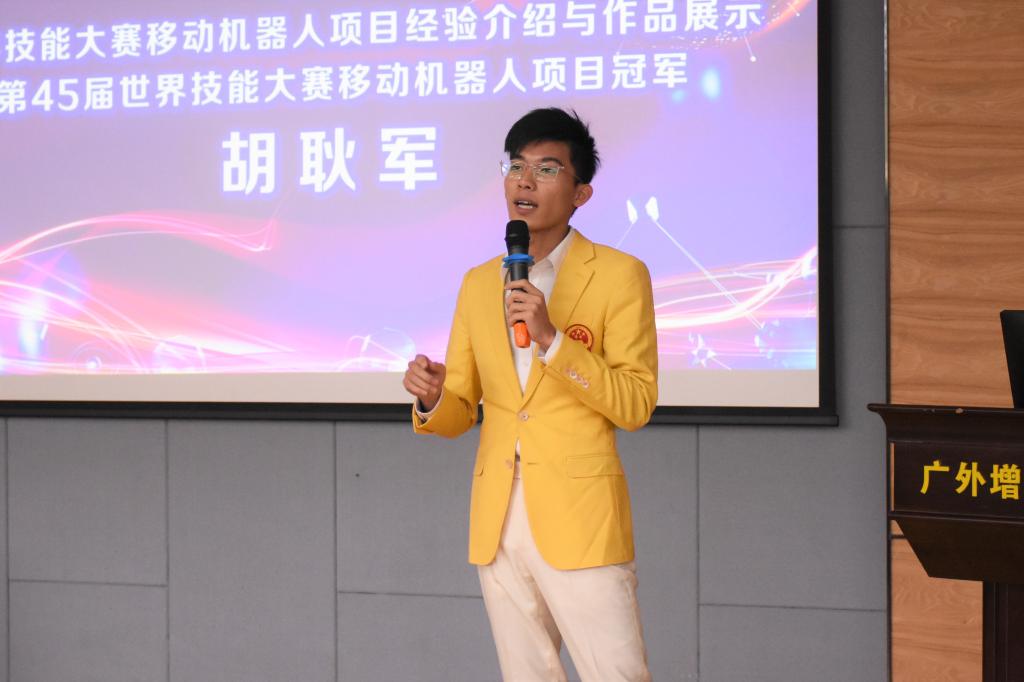 第45届世界技能大赛移动机器人项目冠军,广州机电技师学院学生胡耿军分享了他的夺冠历程,他说:取得冠军不是终点,而是另一段人生的开始。科技日新月异,科技教育也不断创新改进,因此我们要不断提升自己,学习、探索、创新。
