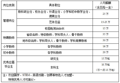 3、福利:免费高端教师公寓,含高档三栖空间(休息、阅读、健身、娱乐、交流等一体);学校提供免费三餐;子女享受高额优惠入学。