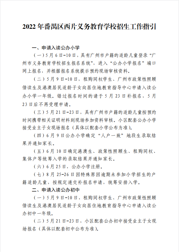 1.网上报名时间:2022年5月6—10日,符合地段生条件的学生家长自行登录“广州市义务教育学校招生报名系统(http://zs.gzeducm.cn)”之“公办学校报名系统”进行网上报名。填写新生基本信息、户籍信息、住房信息、监护人信息等,确认无误后保存并提交。请家长在提交信息前,务必仔细核对所填信息,确保真实、准确。